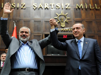 Erdoğan'ın konuşması sırasında Gazze'deki Filistin Yönetimi Başbakanı İsmail Haniye salona girdi. Erdoğan alkışlarla karşılanan Haniye'yle selamlaştı.